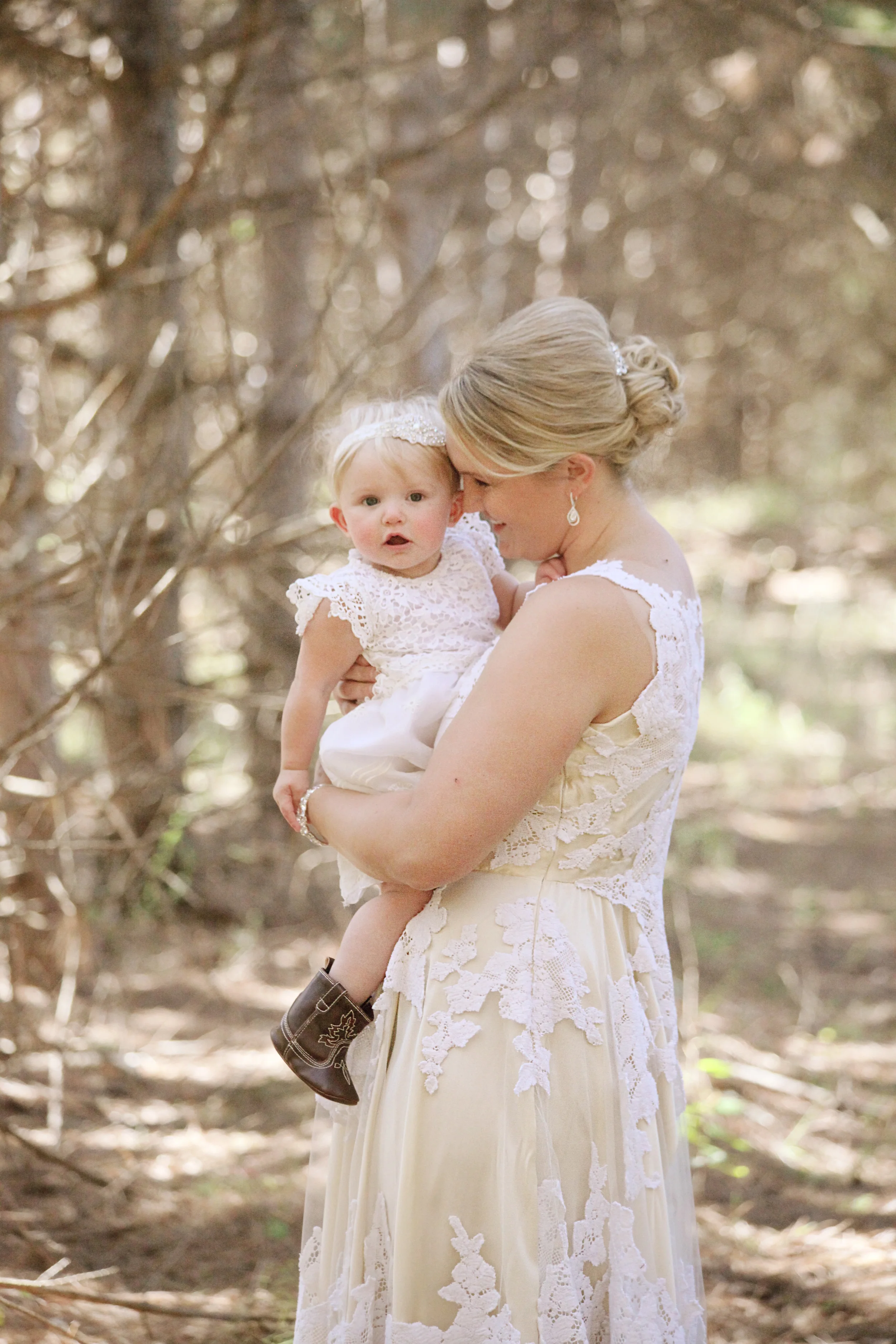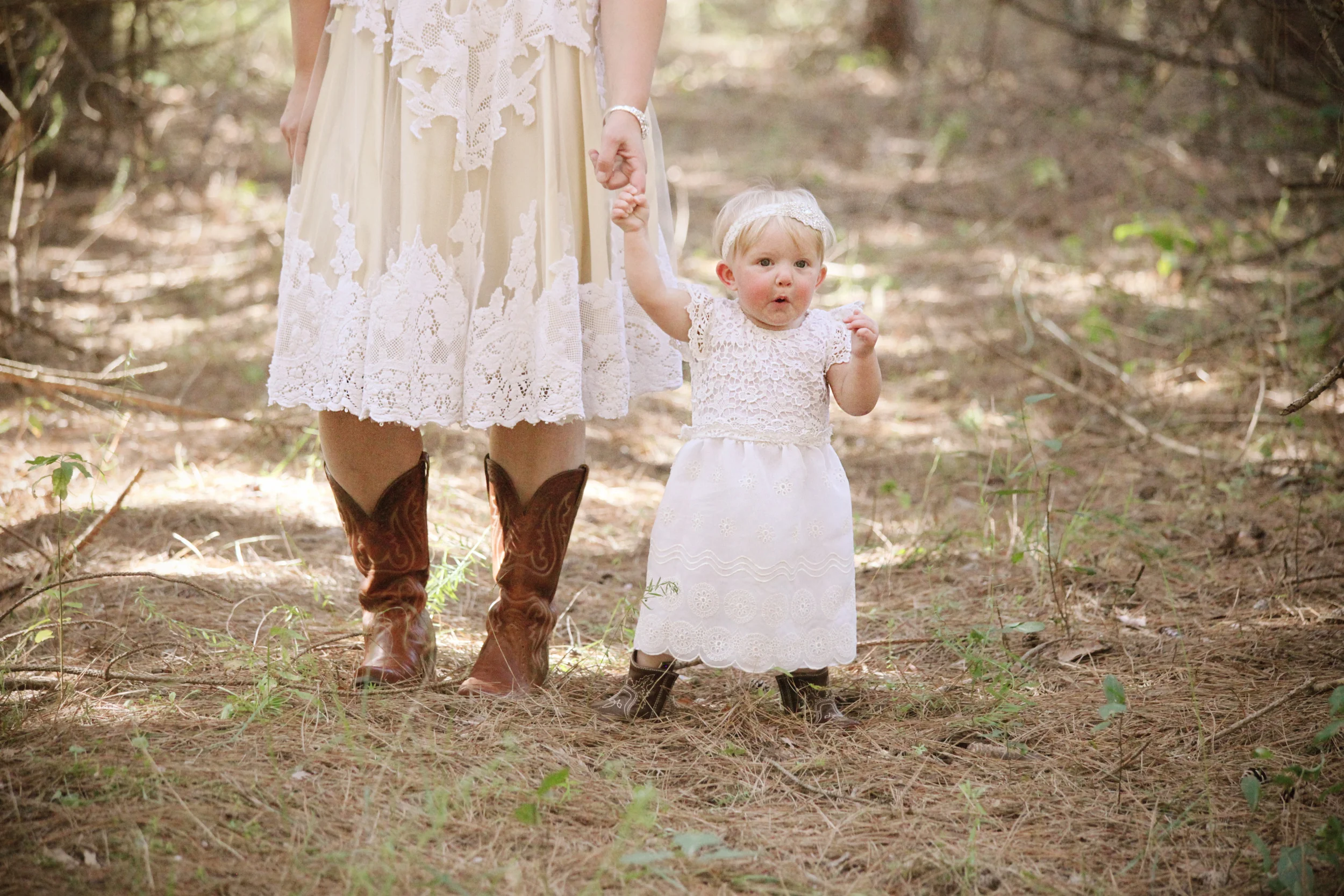 Our lovely linyage lady Jenna is every bit a country girl to her heart, as is her nearly one year old daughter, Britton, who stole our hearts before we had a moment to think. Jenna knew that they both would be wearing their beloved cowboy boots, and she wanted both she and Britton's dress to feel well suited for the woodland wedding that took place amongst the vast land and crisp air. We have never made a creation quite like this, and certainly have never had the (amazing) opportunity to make one for a mini-me of the bride.